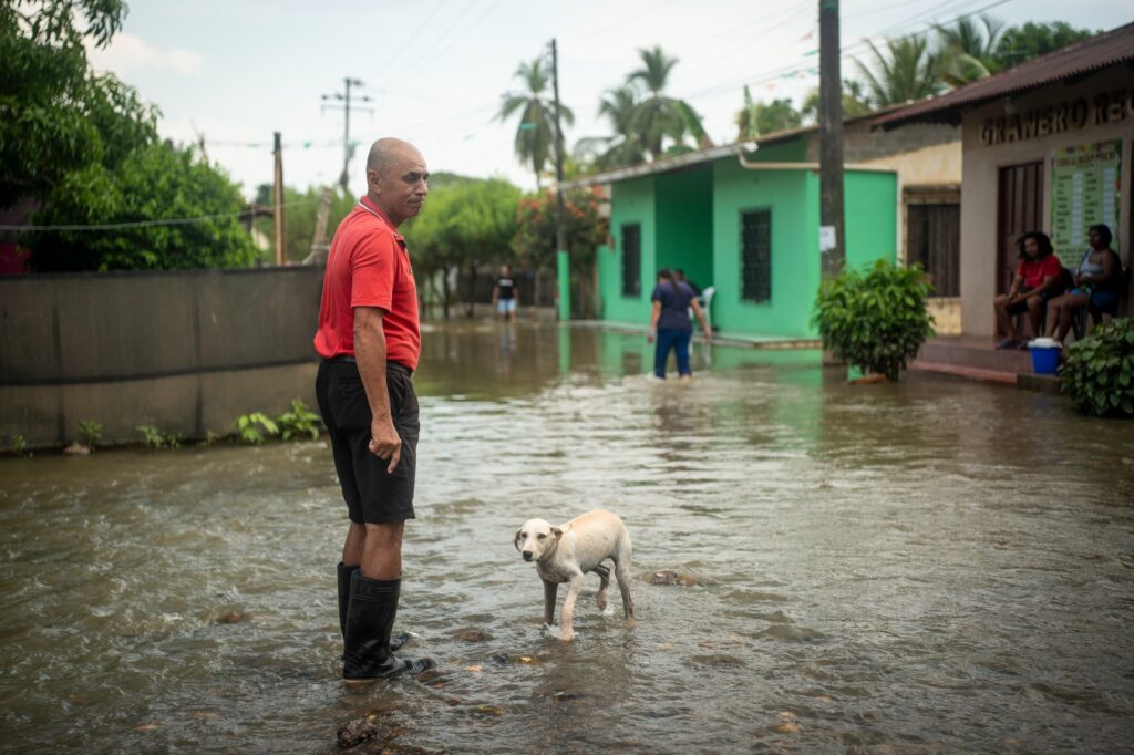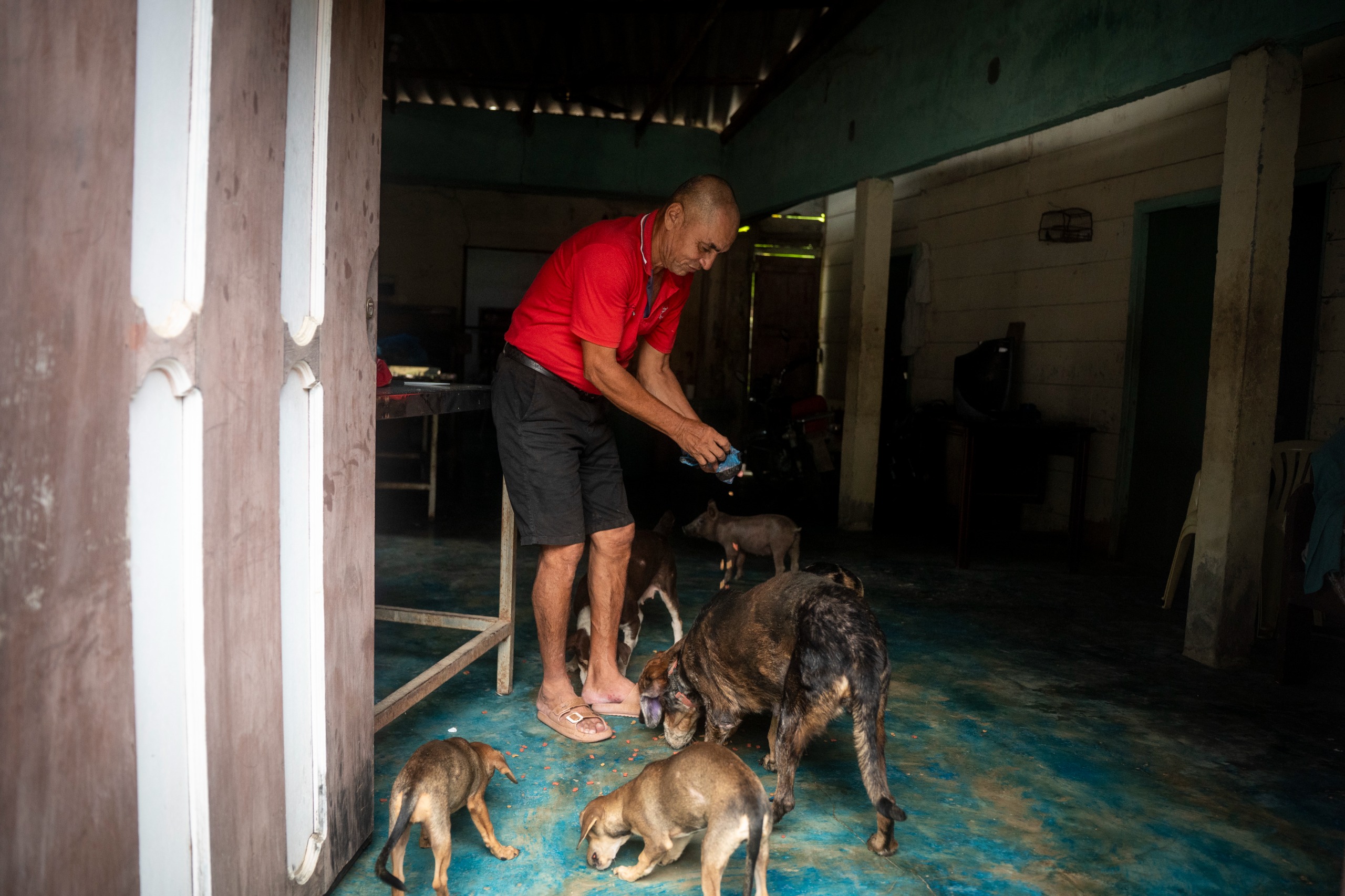 Cuando pasa por las casas de los vecinos que tienen mascotas les recuerda que en su casa hay “purina” —comida para mascotas— que han donado. “Pasen y me piden”. Los vecinos toman su llamado y, de a poco, llegan a su casa esquinera, donde el agua aún alcanza los tobillos y en la que vive con sus hijos, tres perros y un gato.